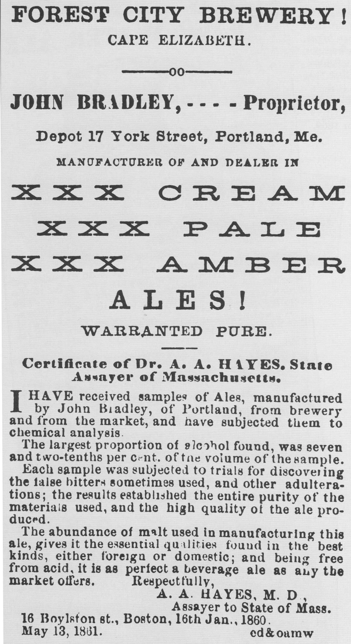 John Bradley’s first foray into commercial brewing was with the Forest City Brewery, which he opened with James and Patrick McGlinchy in South Portland in 1858. Around that time, he also opened a depot to sell Forest City’s cream, pale, and amber ales on 17 York Street (53 York by today’s numbering). After the Cape Elizabeth brewery closed in the early 1870s, Bradley continued to brew on York Street until ca. 1875.